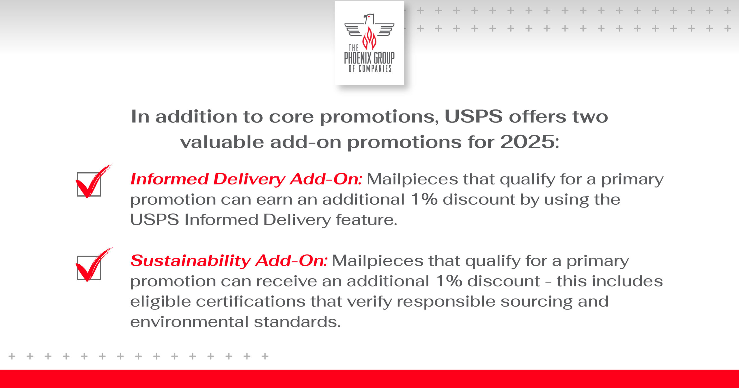 In addition to the core promotions, USPS offers two valuable add-on promotions for 2025. The add-on promotions last throughout the entire year. For example, the Informed Delivery Add-On and the Sustainability Add-On are both available across all eligible campaign windows, provided you meet the specific criteria for each promotion. This means you can stack them with the core promotions during their respective campaign windows to maximize savings.